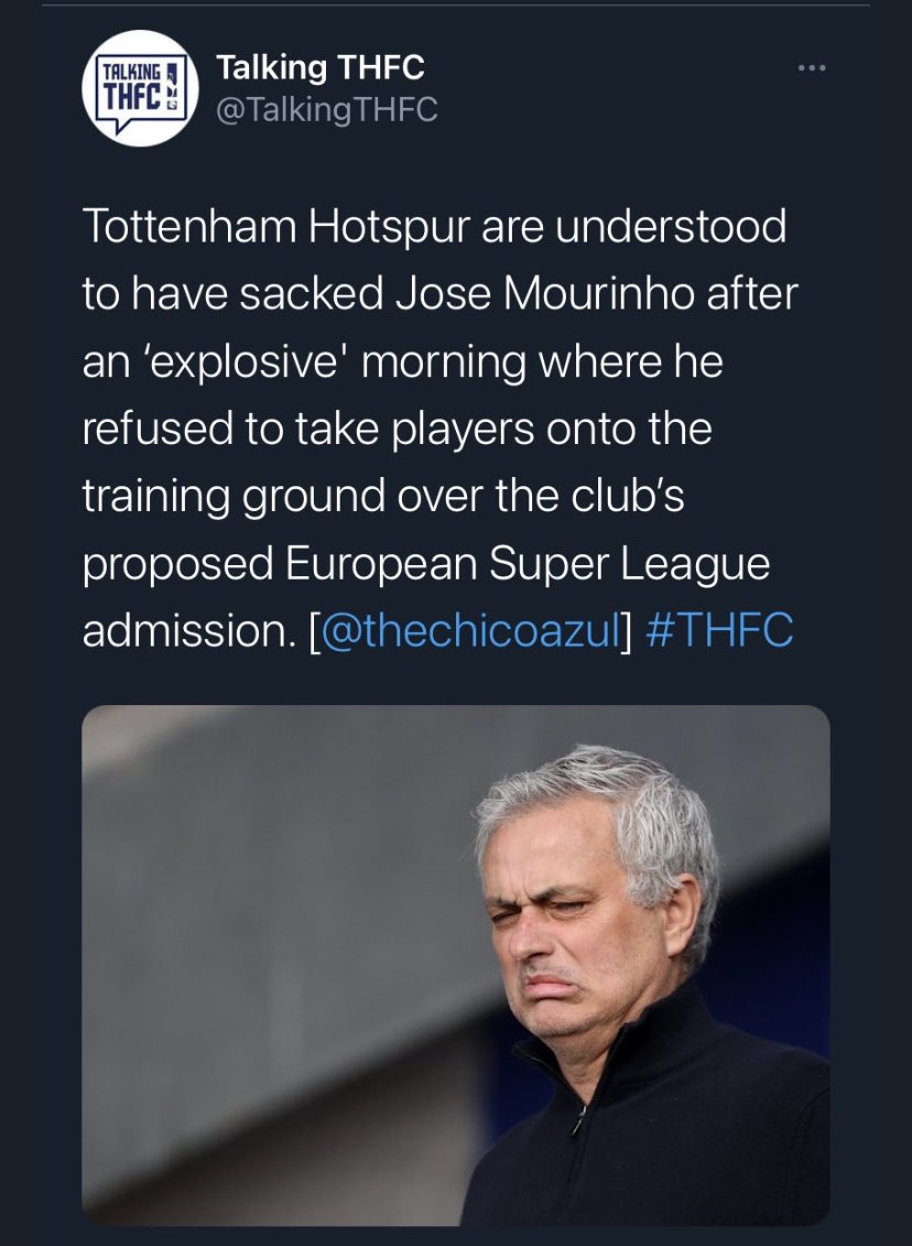 URZZZZgenome @Dan_KP #thfc Club source insisting ‘zero link’ between Super League announcement and timing of sacking. Understand caretaker - looks like Mason & Powell - to be in place for rest of the season.